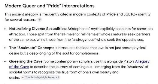 Context: In the Symposium, Aristophanes explains that humans were originally two-headed, four-armed beings split in half by Zeus as punishment.